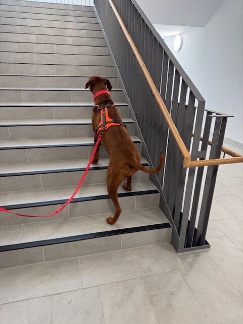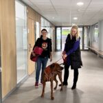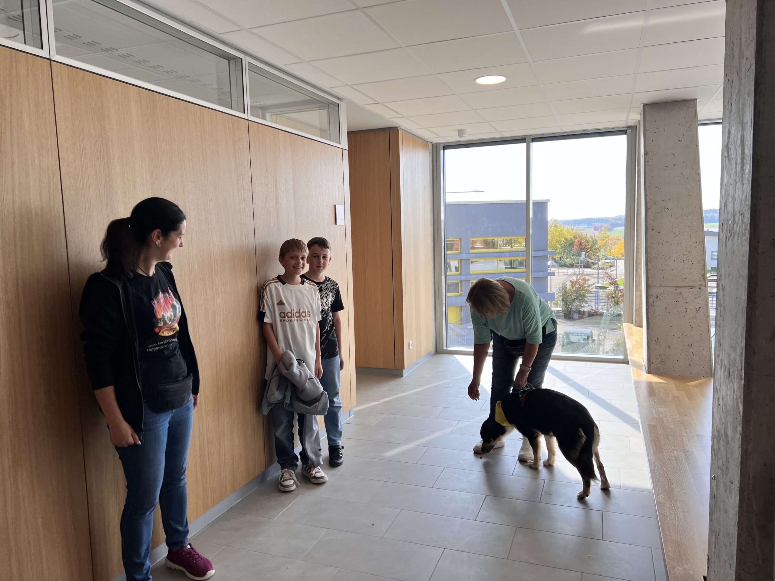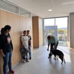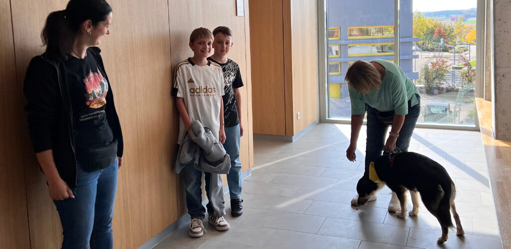 Nach einer kurzen Einweisung und Gewöhnung für die Hunde und die Schülerinnen und Schüler konnte es losgehen: Die Schülerinnen und Schülerversteckten sich im Schulhaus und die Hunde nahmen an einer Jacke den Geruch auf und fingen dann an nur über den Geruchssinn die Fährte zu verfolgen. Erstaunlich, dass das so gut geklappt hat, obwohl so viele Menschen am Vormittag im Gebäude waren. Alle drei Hunde fanden ihre Zielpersonen, was für die beteiligten Schülerinnenund Schüler überraschend war.