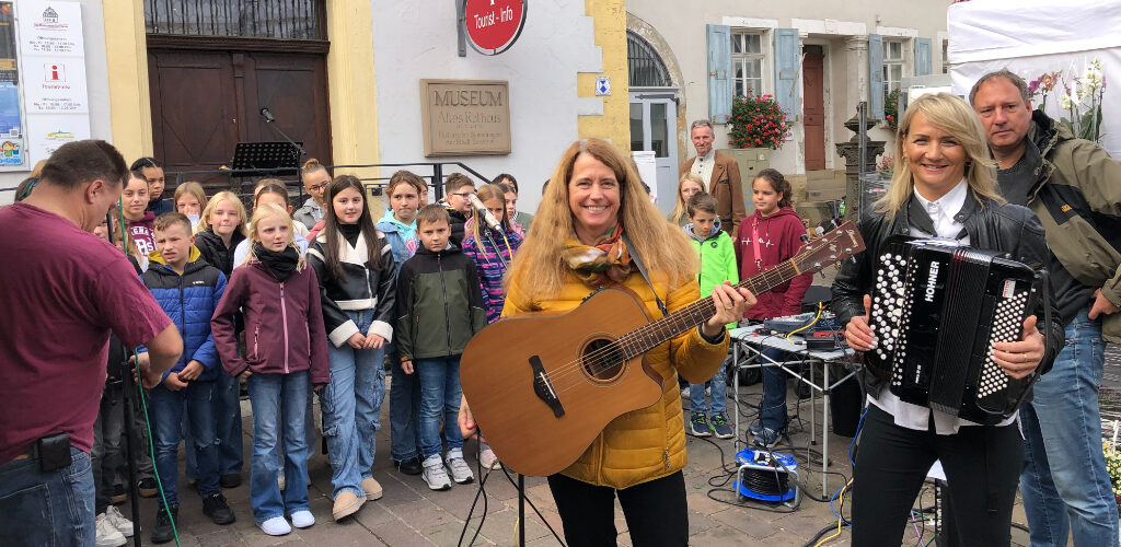 56 Kinder sangen das Lied „Ich liebe Sinsheim“, dessen Text eigens von Heike Witt verfasst wurde. Am Akkordeon unterstützte Elena Buchalla. Der Auftritt war ein voller Erfolg und animierte das Publikum zum Mitsingen.