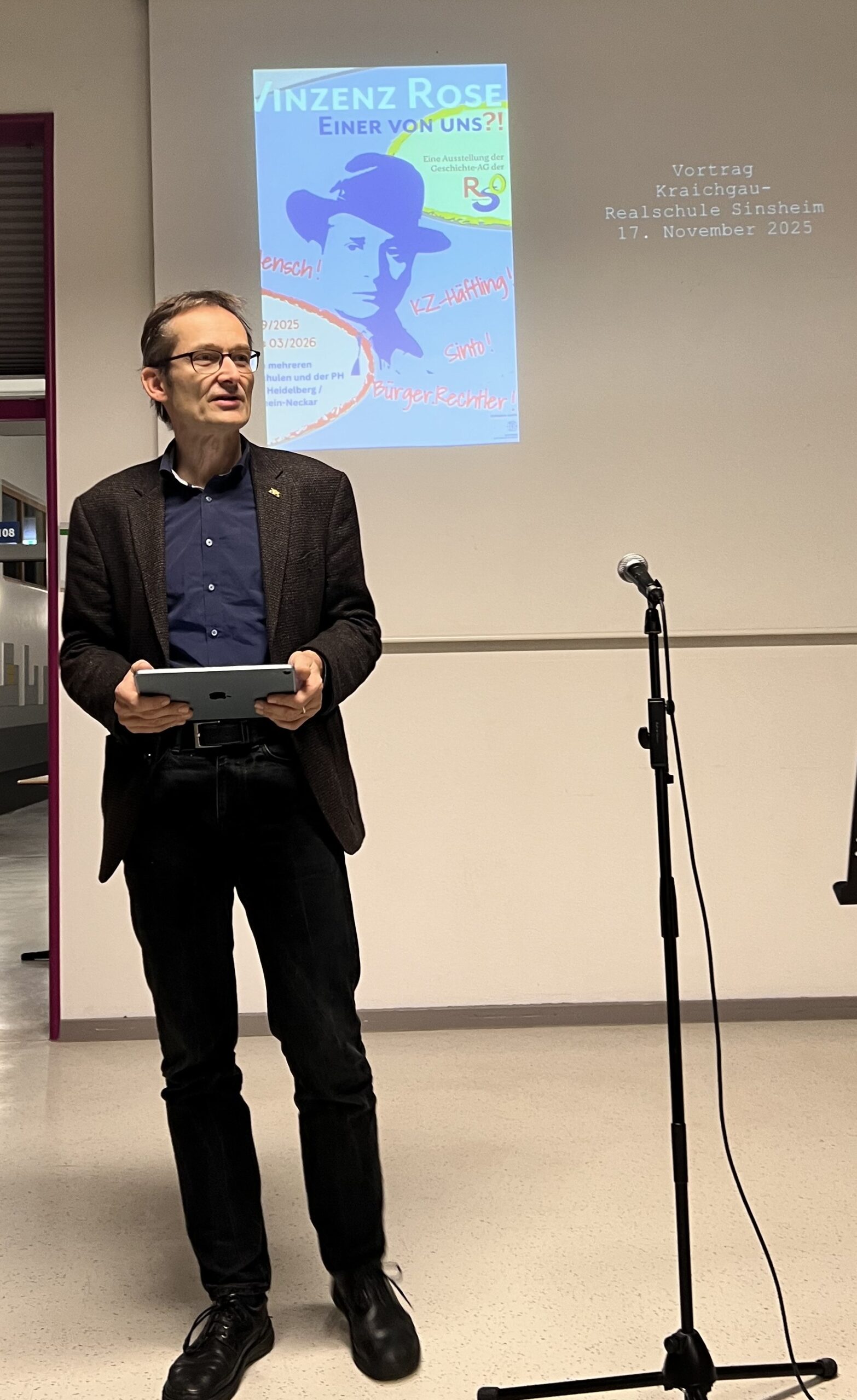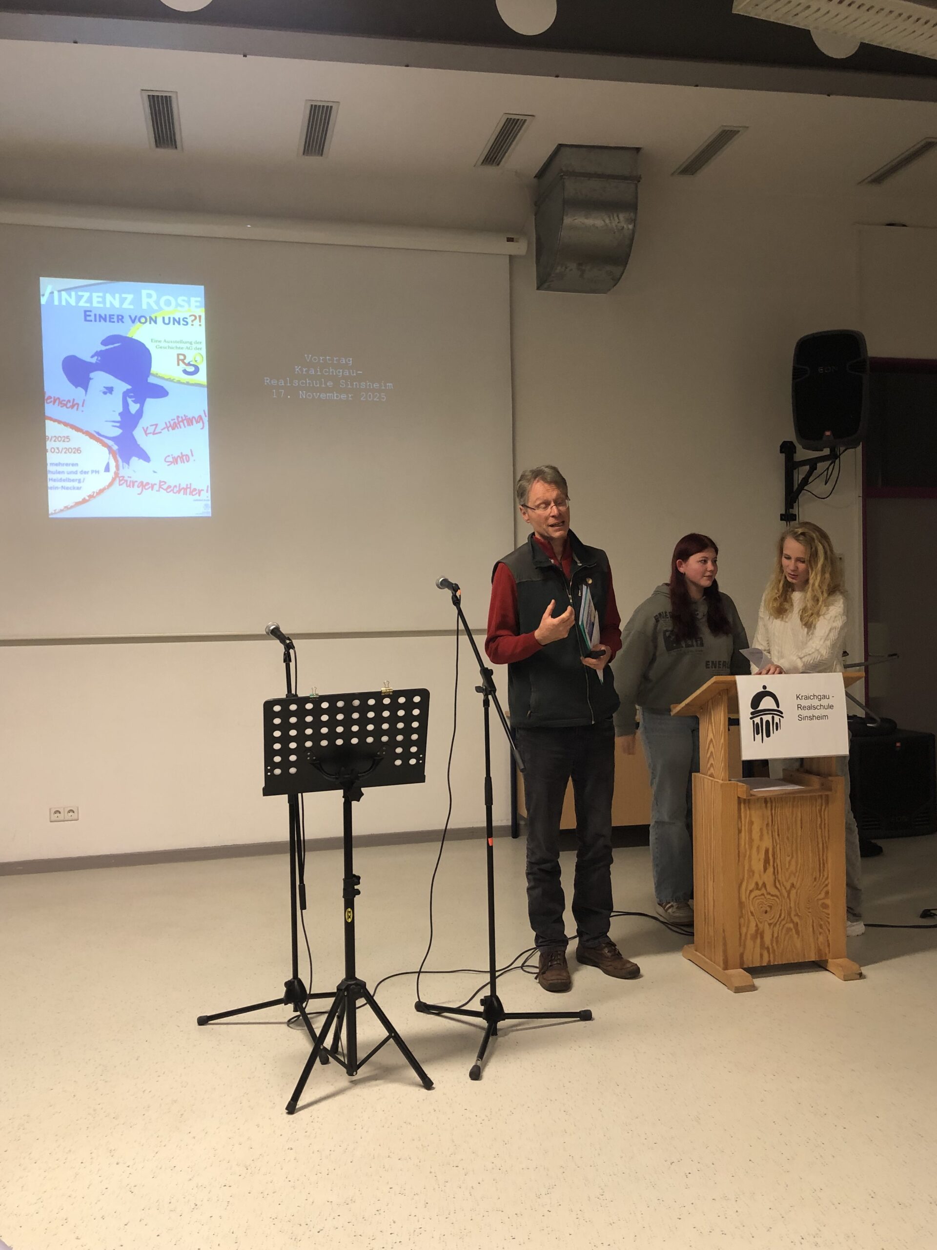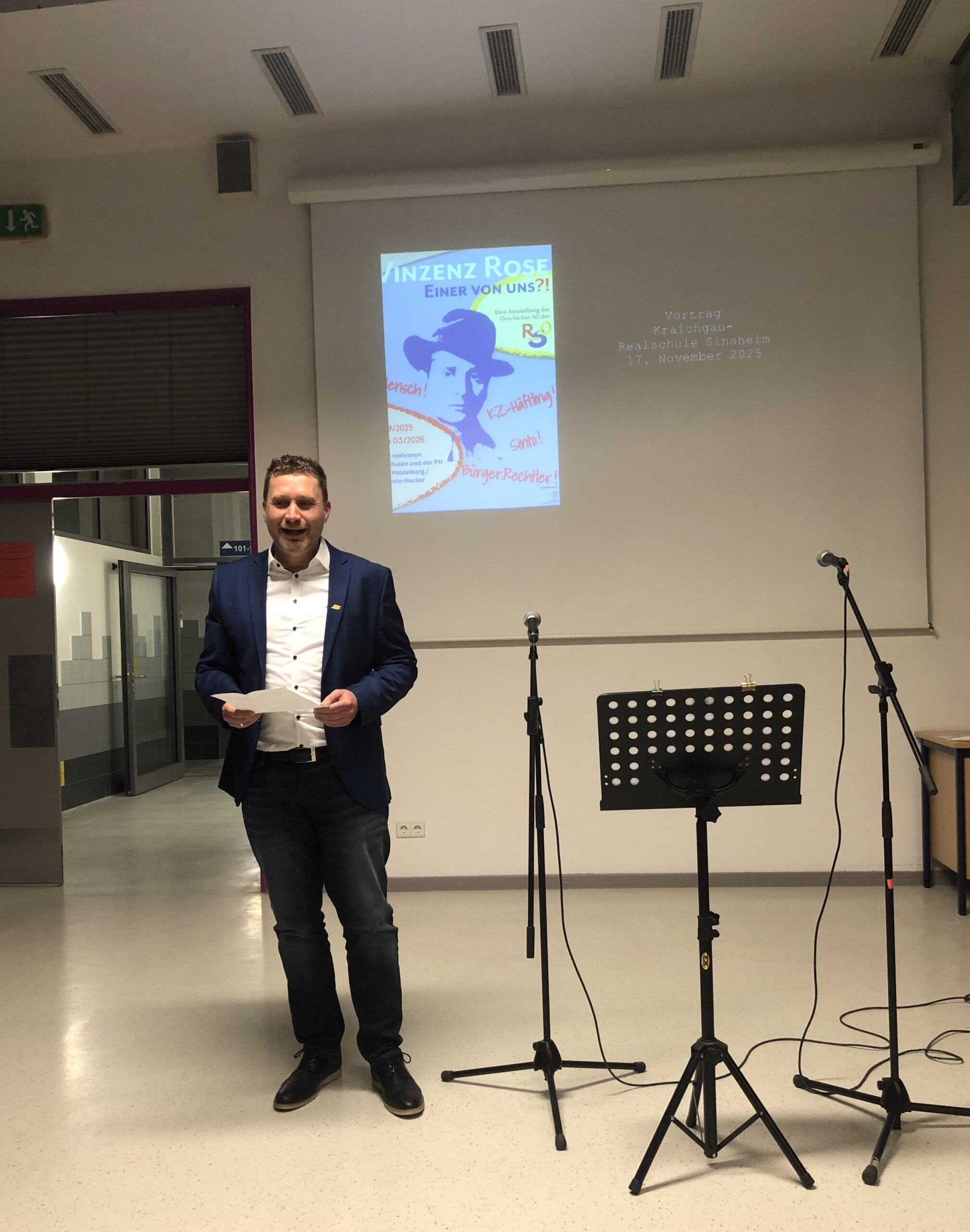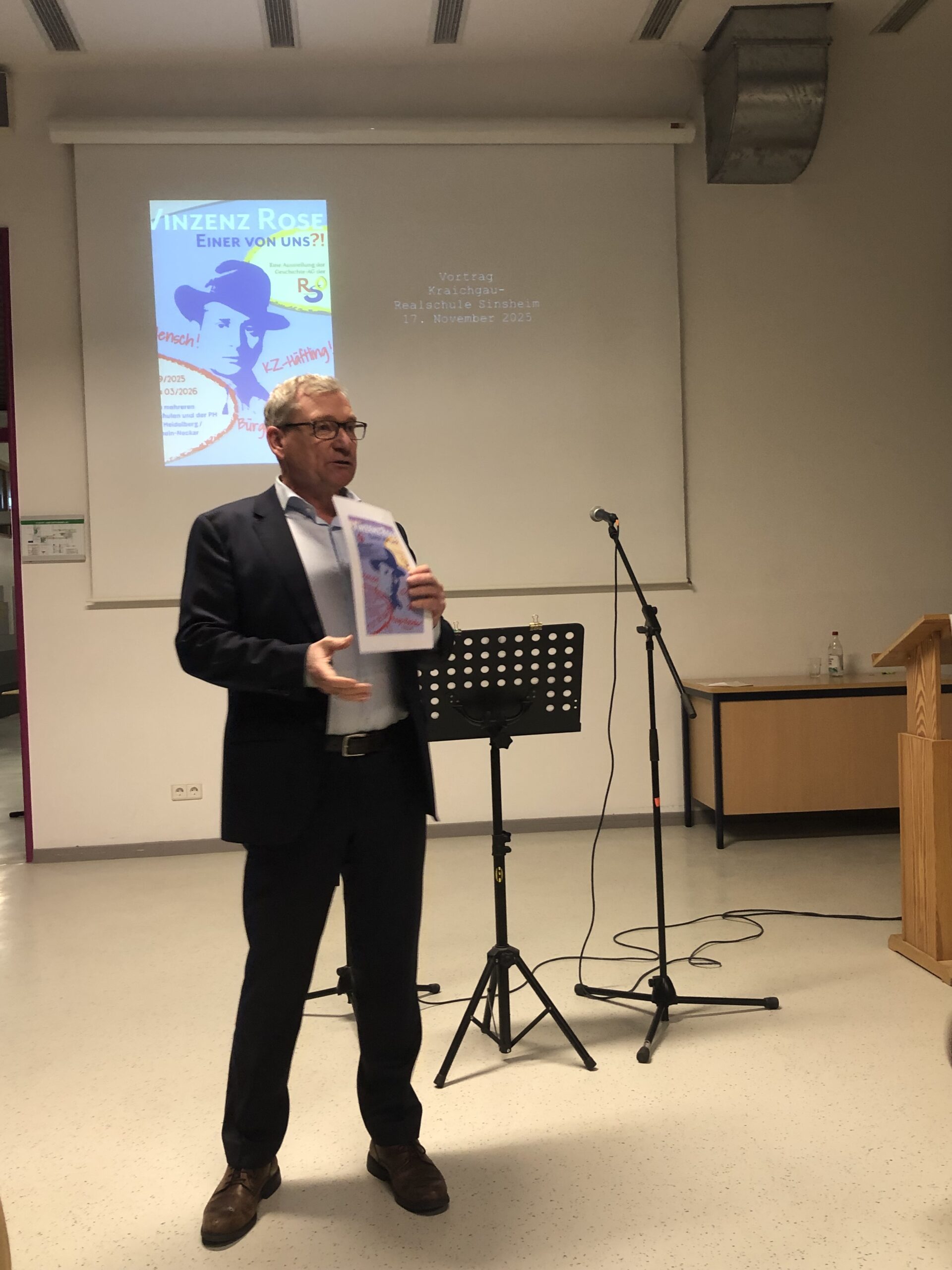 Eir freuen uns sehr, dass es uns gelungen ist, die Ausstellung „Vinzenz Rose- Einer von uns ?!“ an der Kraichgau-Realschule Sinsheim vom 17.11.25 bis zum 09.12.25 zeigen zu können. Die Ausstellung wurde von der Geschichts-AG der Realschule Obrigheim entwickelt und gestaltet. Die Ausstellung erzählt vom Leben von Vinzenz Rose, der im April 1944 ins Außenlager Neckarelz deportiert wurde.