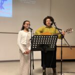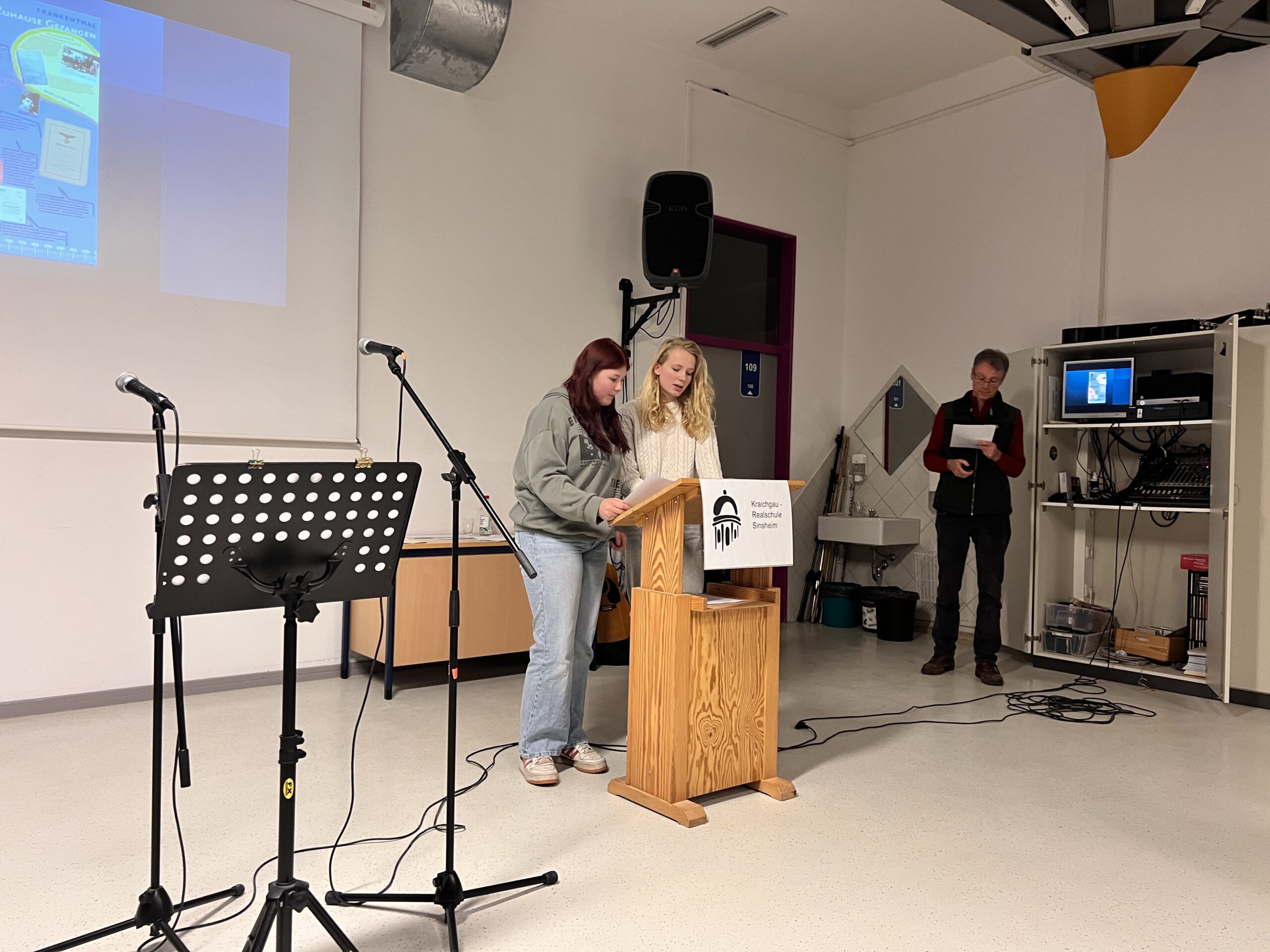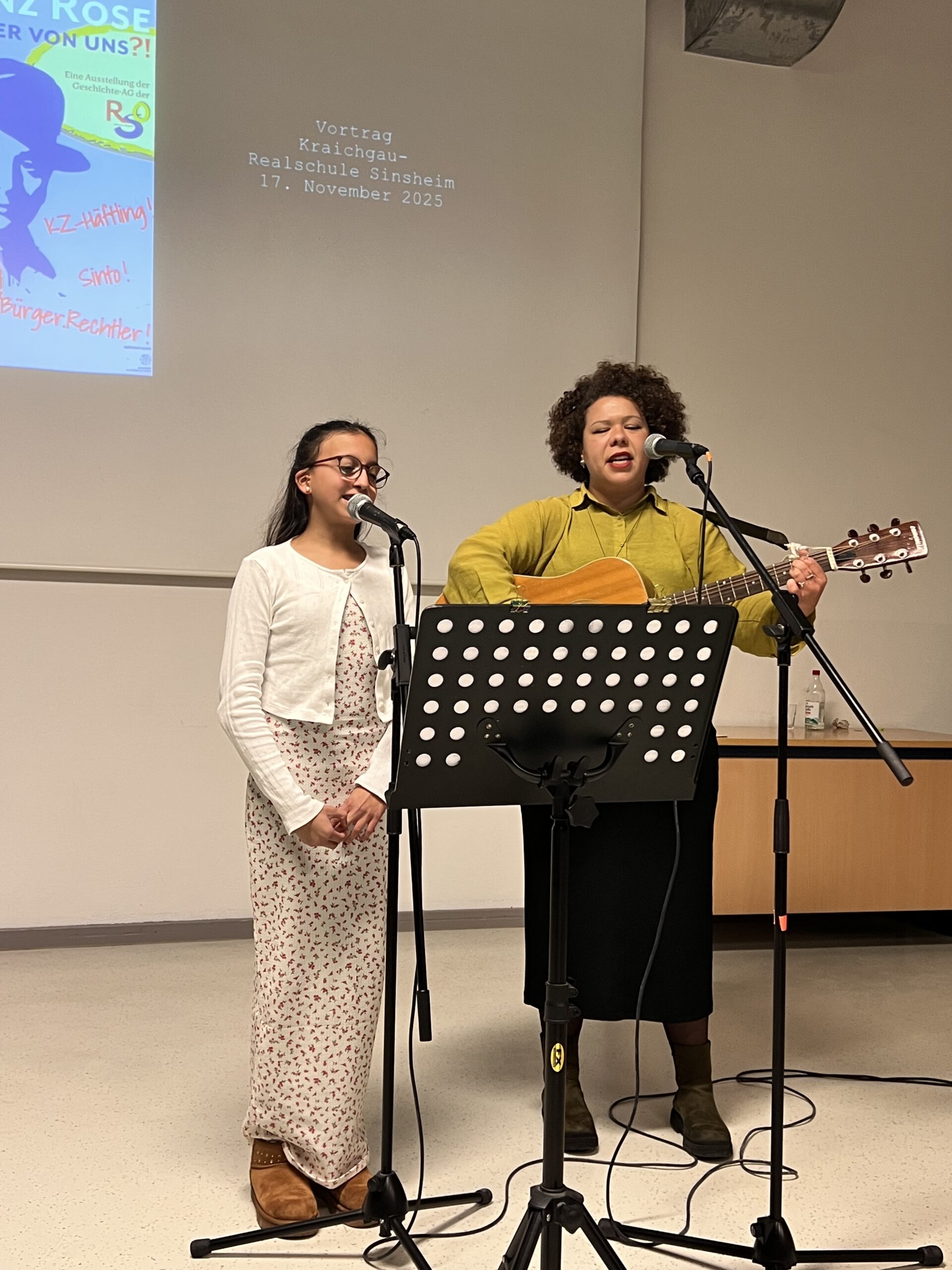 Bevor Bernhard Edin als Leiter der Geschichte-AG der Realschule Obrigheim einleitende Worte zur Ausstellung sagte, sang Lea Christopher aus der Klasse 7b zusammen mit ihrer Lehrerin Leila Ullmann das Lied „Augen auf“ von Sarah Connor, das das Publikum sofort in den Bann zog.