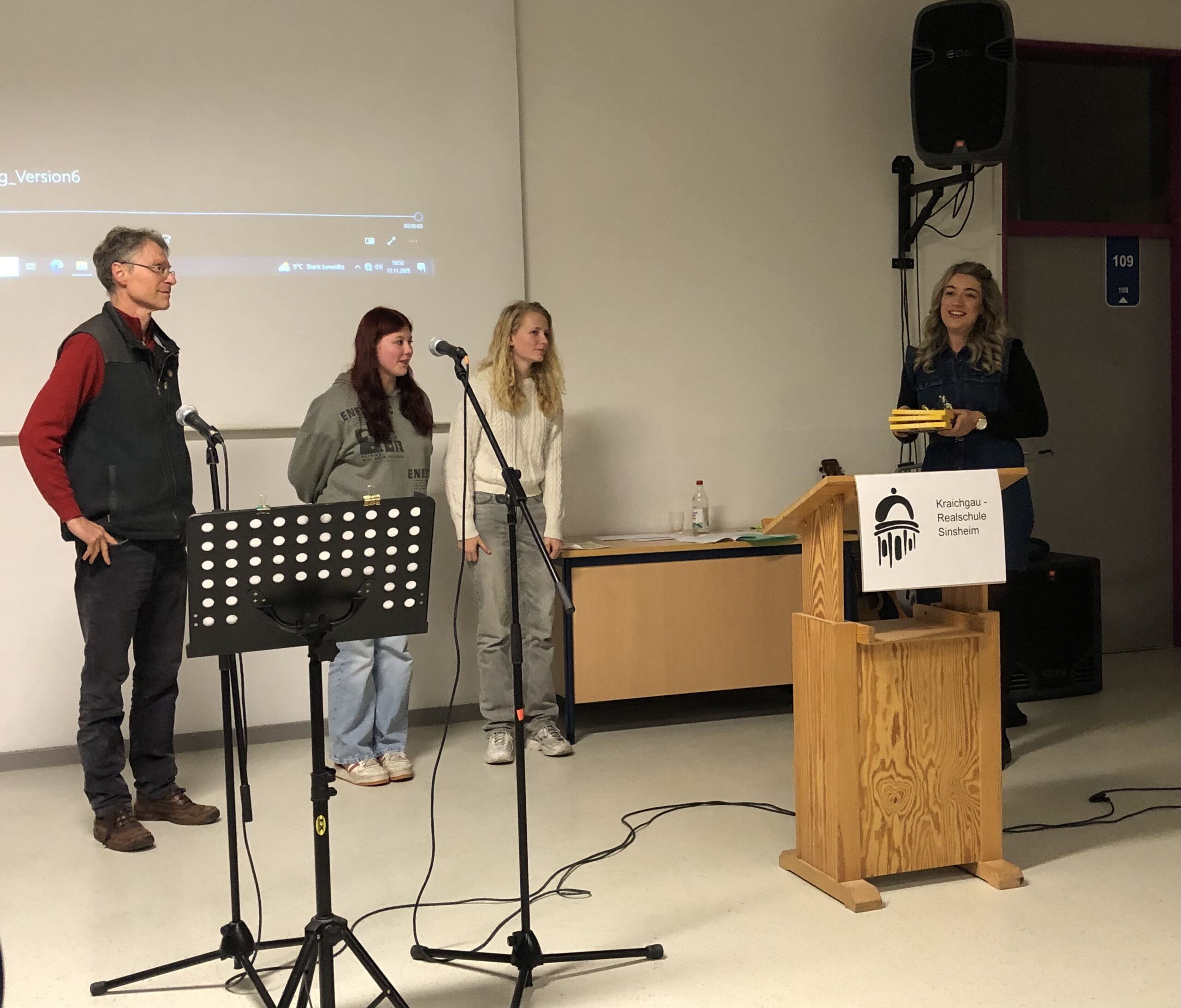 Am Montagabend, dem 17.11.25 wurde die Ausstellung feierlich eröffnet. Schulleiter Holger Gutwald-Rondot, Johannes Wolf für die Stadt Sinsheim sowie der Grünen-Landtagsabgeordnete Hermino Katzenstein begrüßten die Gäste. Zur Ausstellungseröffnung waren Vertreterinnen und Vertreter vom Bündnis für Toleranz, vom Synagogenverein Steinsfurt, aus dem Gemeinderat, der Elternschaft, der Lehrerschaft sowie Schülersprecherteam gekommen.