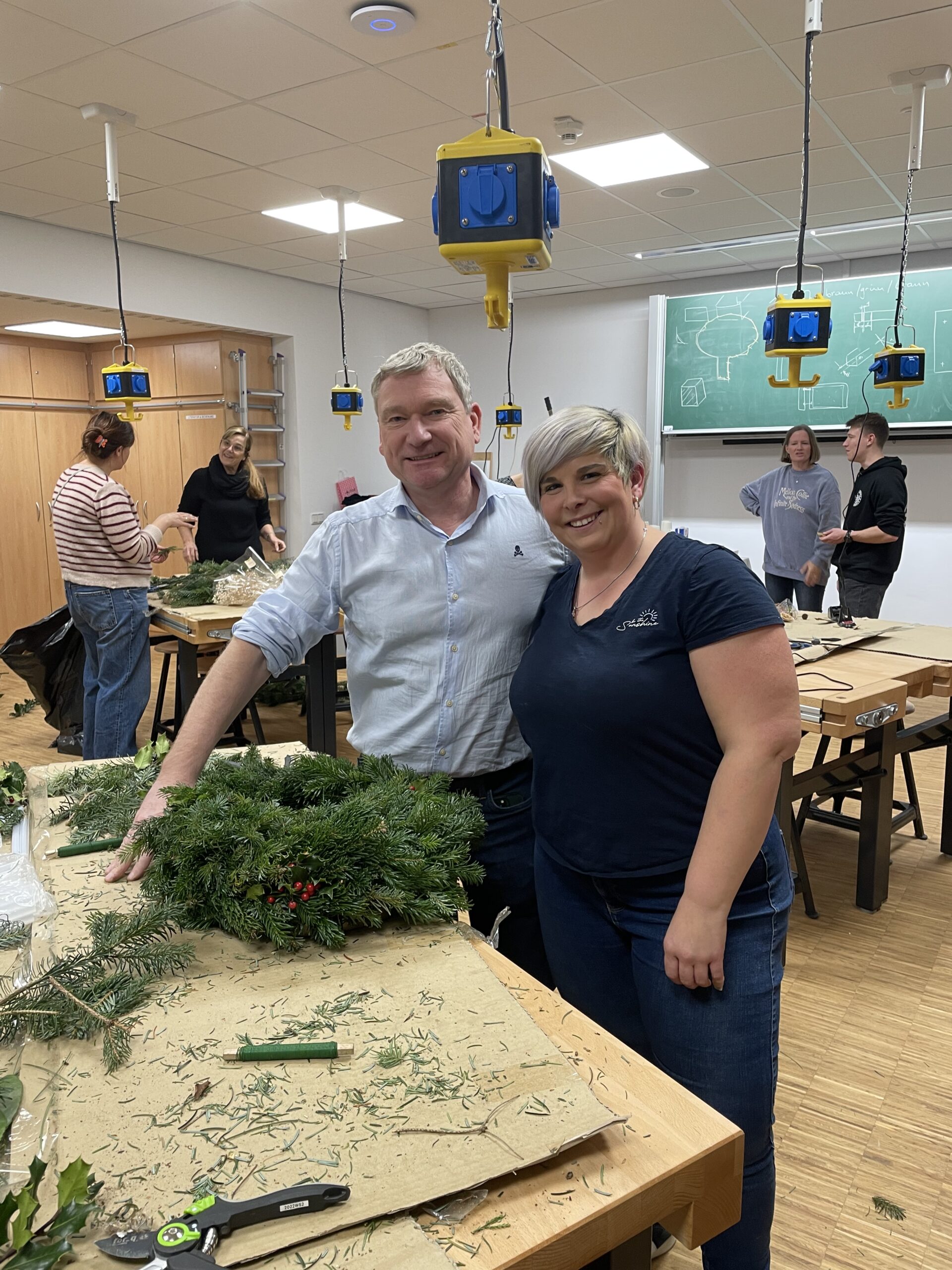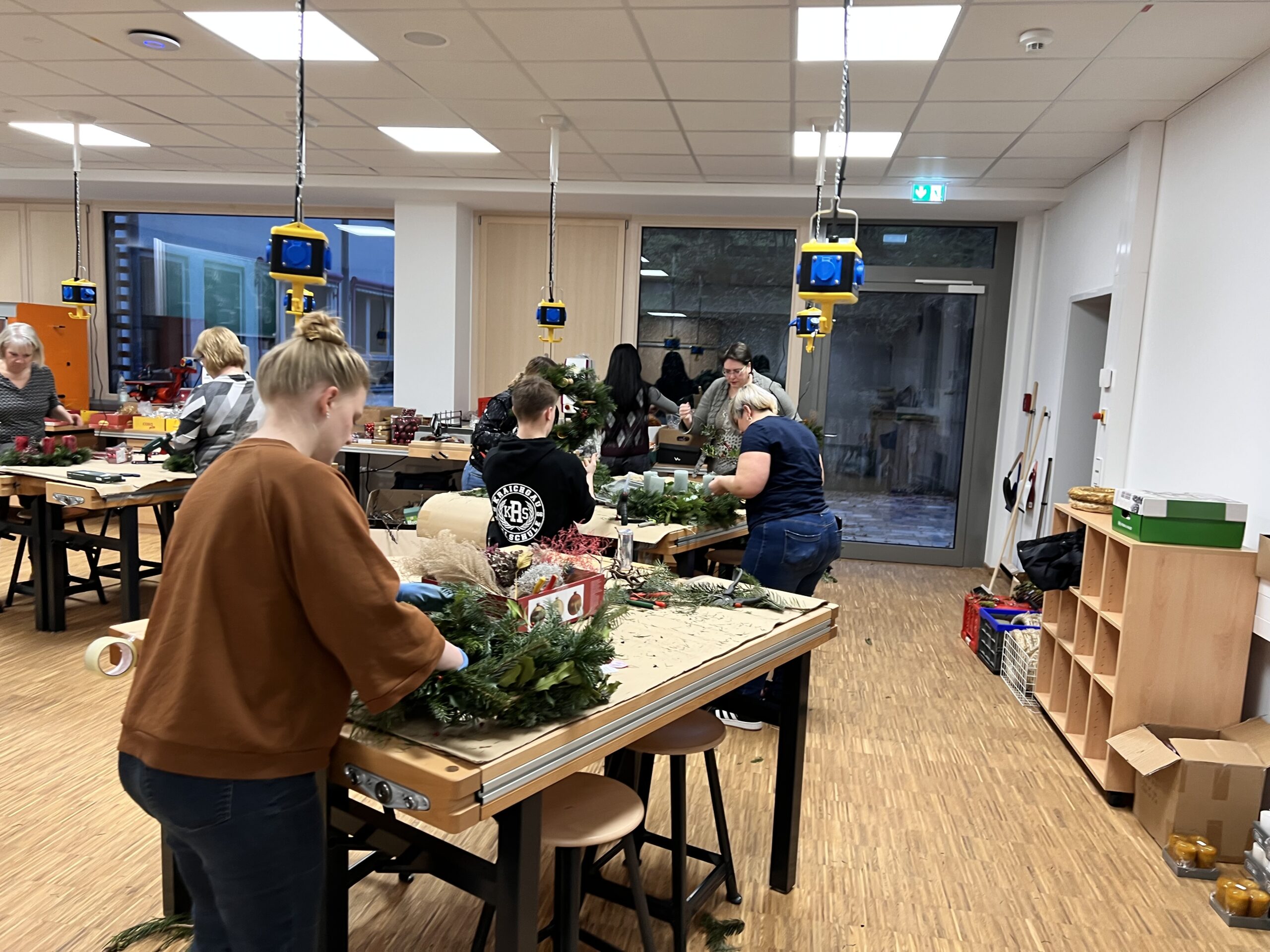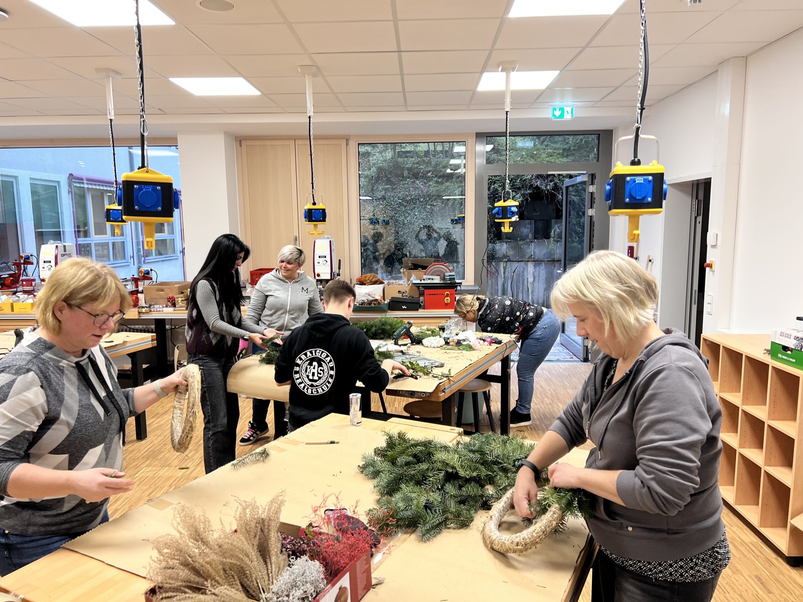 Der Duft von Tannennadeln und Kaffee war in der ganzen Schule zu riechen, als der Elternbeirat und der Freundeskreis am 26.und am 27.11.25 zum Adventsworkshop einluden. Im Werkraum konnten die Teilnehmerinnen und Teilnehmer unter fachkundiger Anleitung selbst ihre Adventskränze binden und auch schmücken. Bis in die Abendstunden wurde eifrig gebastelt, geschnitten und dekoriert. Eine wunderbare Gelegenheit um bei einem Kaffee und einem Lebkuchen mal abseits des Unterrichts miteinander ins Gespräch zu kommen und gleichzeitig etwas Gutes zu tun. Die fast 1000 € Erlös kommen in den gemeinsamen Spendentopf des Sponsorenwandertages und des Weihnachtshauses. In diesem Schuljahr soll das Geld an ein Projekt der SMV, nach Uganda, Indien, Peru und an unseren Freundeskreis gehen.