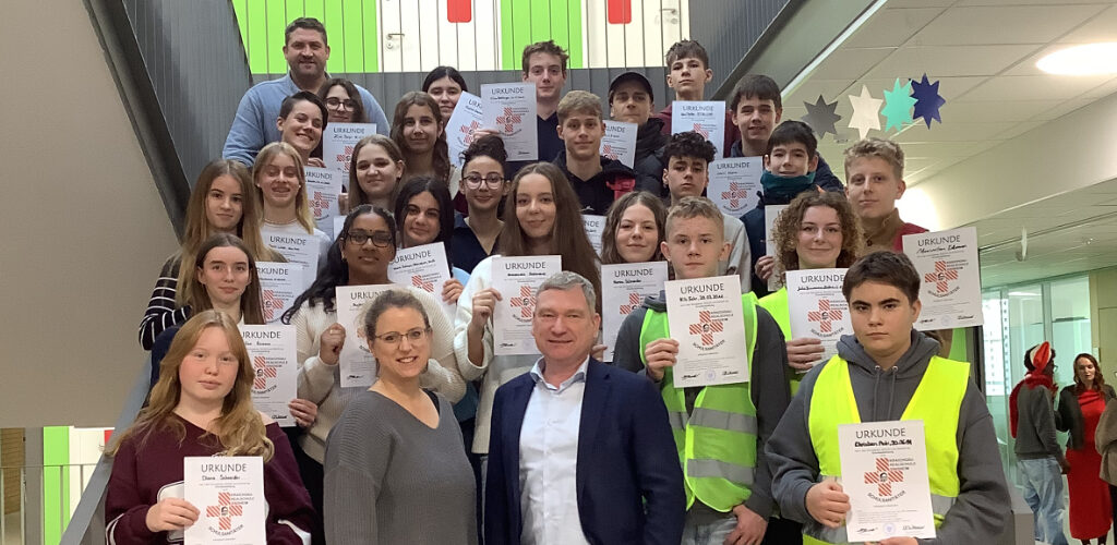 Er hat klein angefangen und wird nun von Jahr zu Jahr größer: Der Schulsanitätsdienst der Kraichgau-Realschule durfte auf der Weihnachtsfeier im Dezember 2025 ganze 27 frisch ausgebildete Schulsanitäter bzw Schulsanitäterinnen ehren. Die SchülerInnen kommen aus zwei neunten Klassen und haben seit Einstieg in die siebte Klassenstufe ein umfangreiches Ausbildungsprogramm in Sachen Erste Hilfe absolviert. Dabei war das Deutsche Rote Kreuz Heidelberg wieder einmal enger und verlässlicher Kooperationspartner für die Schule.