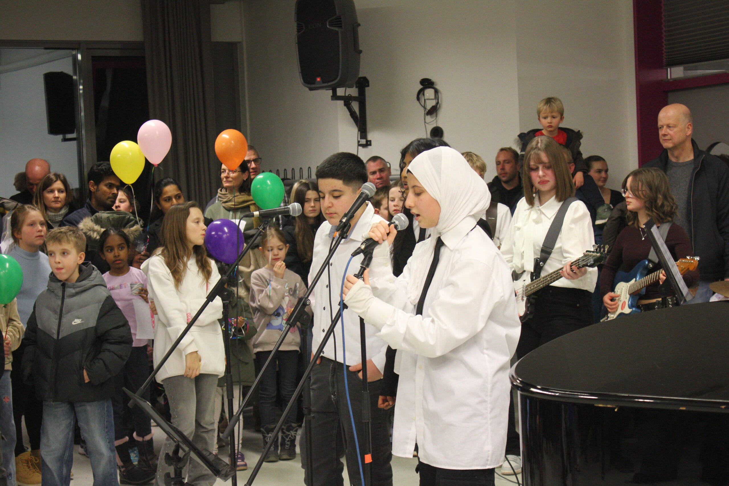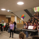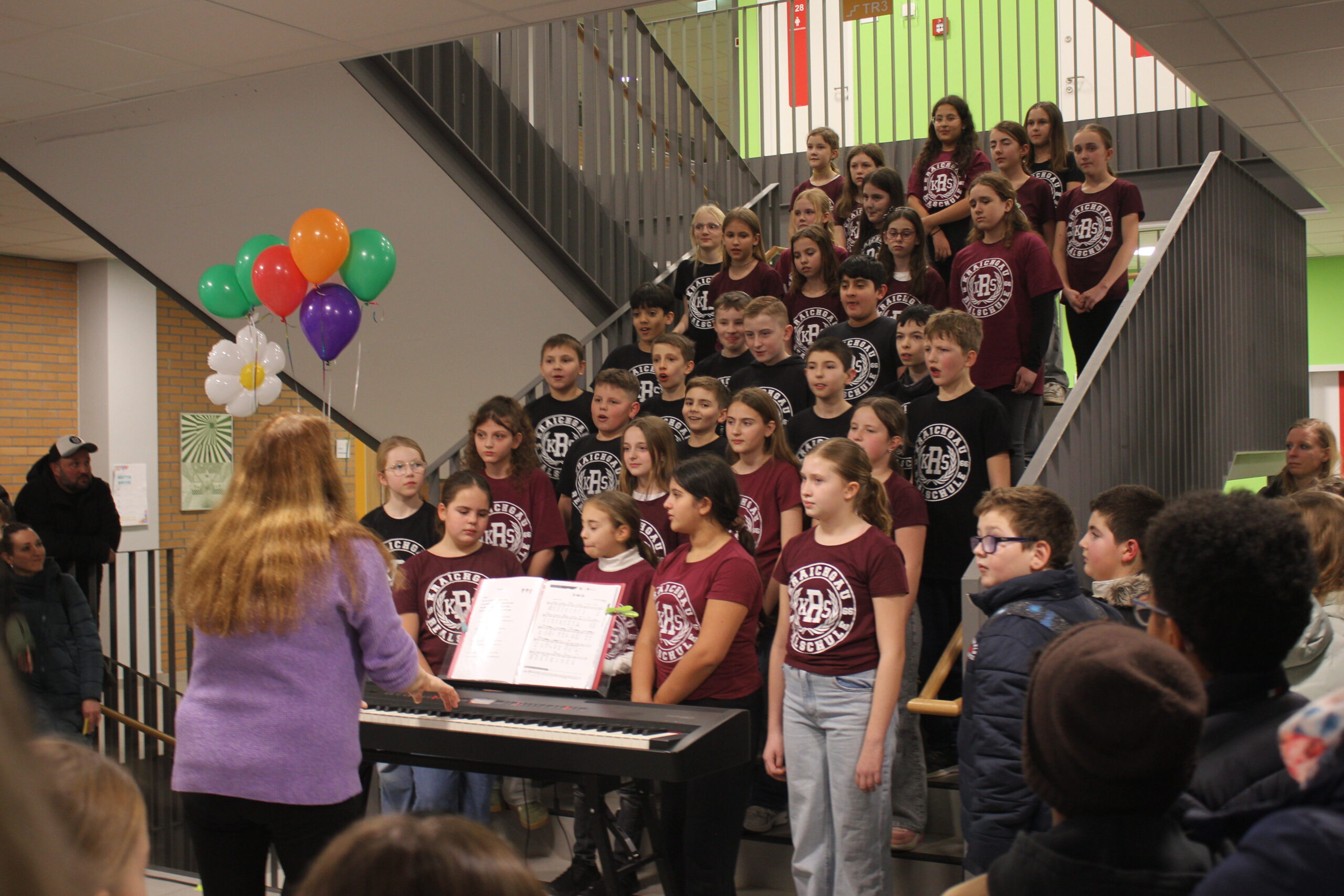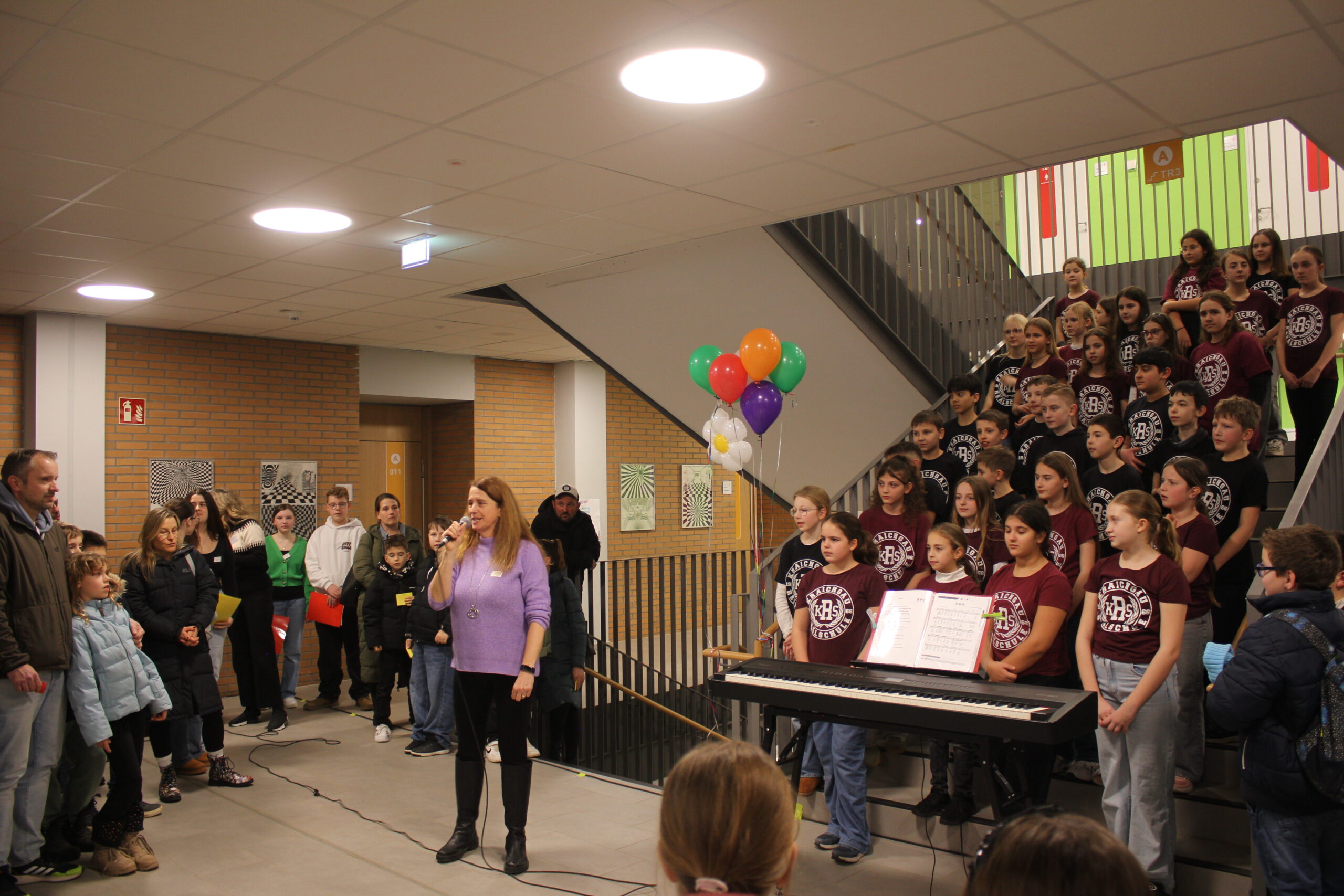 Im Foyer der neu sanierten Kraichgau-Realschule wurden die über zweihundert Gäste mit einem mitreißenden Auftritt der Singklassen unter der Leitung von Heike Witt begrüßt. Beim Betreten der Realschule verteilten die Schülerinnen und Schüler aus der Klasse 9a bunte Kärtchen, die dann zur Gruppeneinteilung führten.