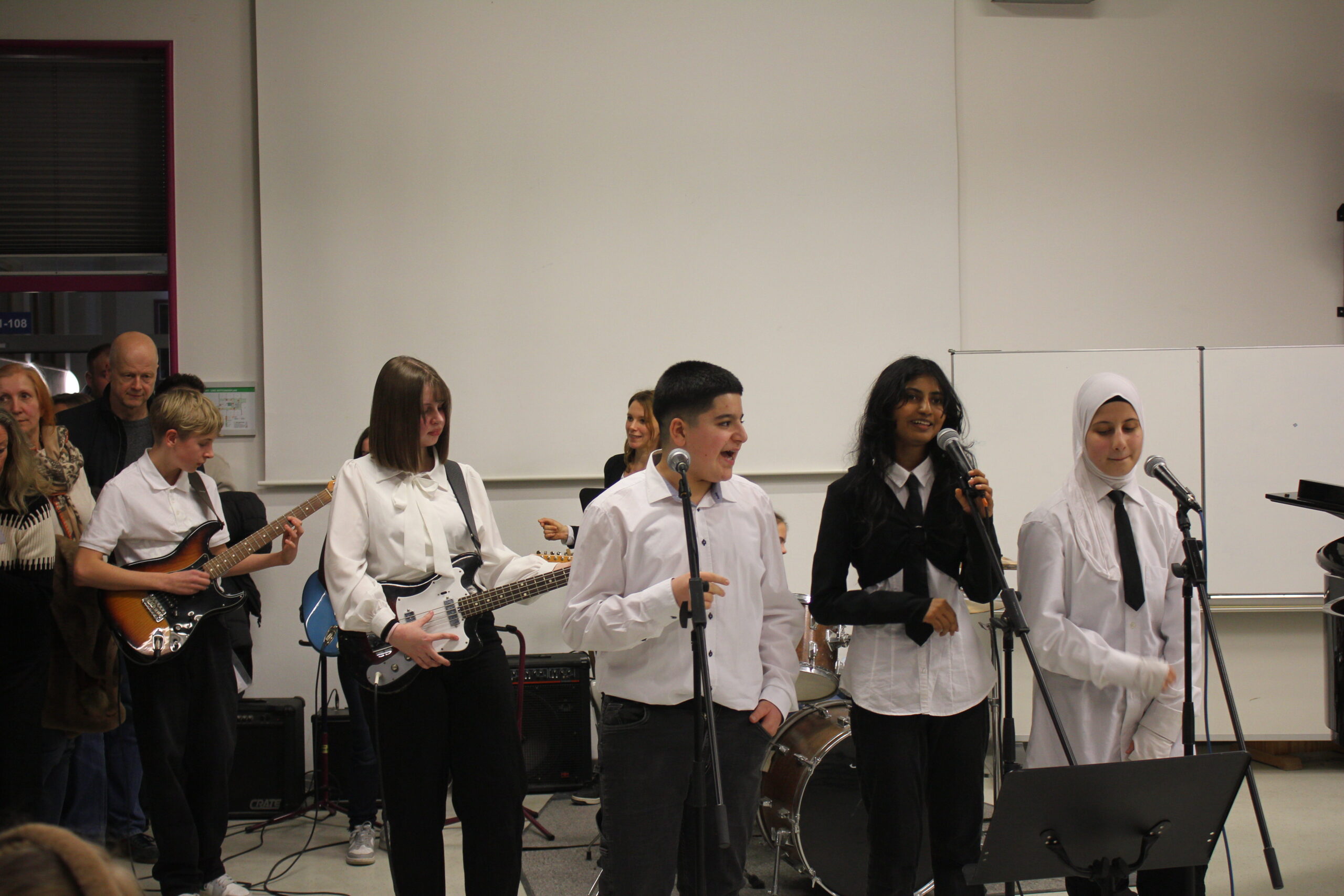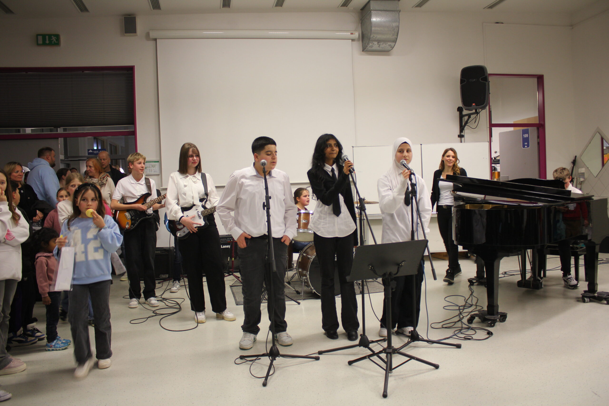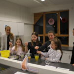 Im Mittelpunkt des Rundgangs durch die Kraichgau-Realschule standen in diesem Jahr die Wahlpflichtfächer der Kraichgau-Realschule und das neue Fach „Informatik und Medienbildung“. Die Fachschaften Technik, Alltagskultur Ernährung und Soziales und Sport sowie die Informatik-Fachschaft hatten jeweils ein Angebot für die Schülerinnen und Schüler sowie die Eltern vorbereitet. In der Turnhalle wartete ein Sportparcours, der das Hauptfach Sport, das ab der sechsten Klasse angeboten wird, vorstellte. Im Technikraum stellte die Technikfachschaft unter der Leitung von Markus Mollner die Werkstätten und den Bau eines Fliegers vor. Martin Koch präsentierte das Fach Informatik und Medienbildung, das nun durchgehend bis Klasse 8 an der Realschule unterrichtet wird. Hier konnten die Schülerinnen und Schüler erste Programmierversuche durchführen. Die Schulküche wurde vom AES-Team, das Nadine Krüger-Schmidt betreute, mit Themen des Unterrichts und Ergebnissen aus der Nähwerkstatt ausgestattet. Hier durften verschieden Leckereien, die frisch in der Schulküche zubereitet wurden, nicht fehlen. Sabine Lager und Holger Gutwald-Rondot stellten den Eltern die Besonderheiten der Kraichgau-Realschule vor und betonten die schulischen Anschlussmöglichkeiten über die Sinsheimer beruflichen Schulen, die bis zum Abitur führen. Der Elternbeirat und der Freundeskreis sorgten während des Rundgangs für Erfrischung und boten verschiedenste Getränke und Äpfel an. Äpfel werden an der Kraichgau-Realschule als Schulobst vom Freundeskreis finanziert und werden den 5. und 6. Klassen kostenlos zur Verfügung gestellt. Im Musiksaal fanden dann nach dem Rundgang wieder alle zusammen. Die Schulband unter der Leitung von Simone Gantert zeigte ihr Können und begeisterte das Publikum.