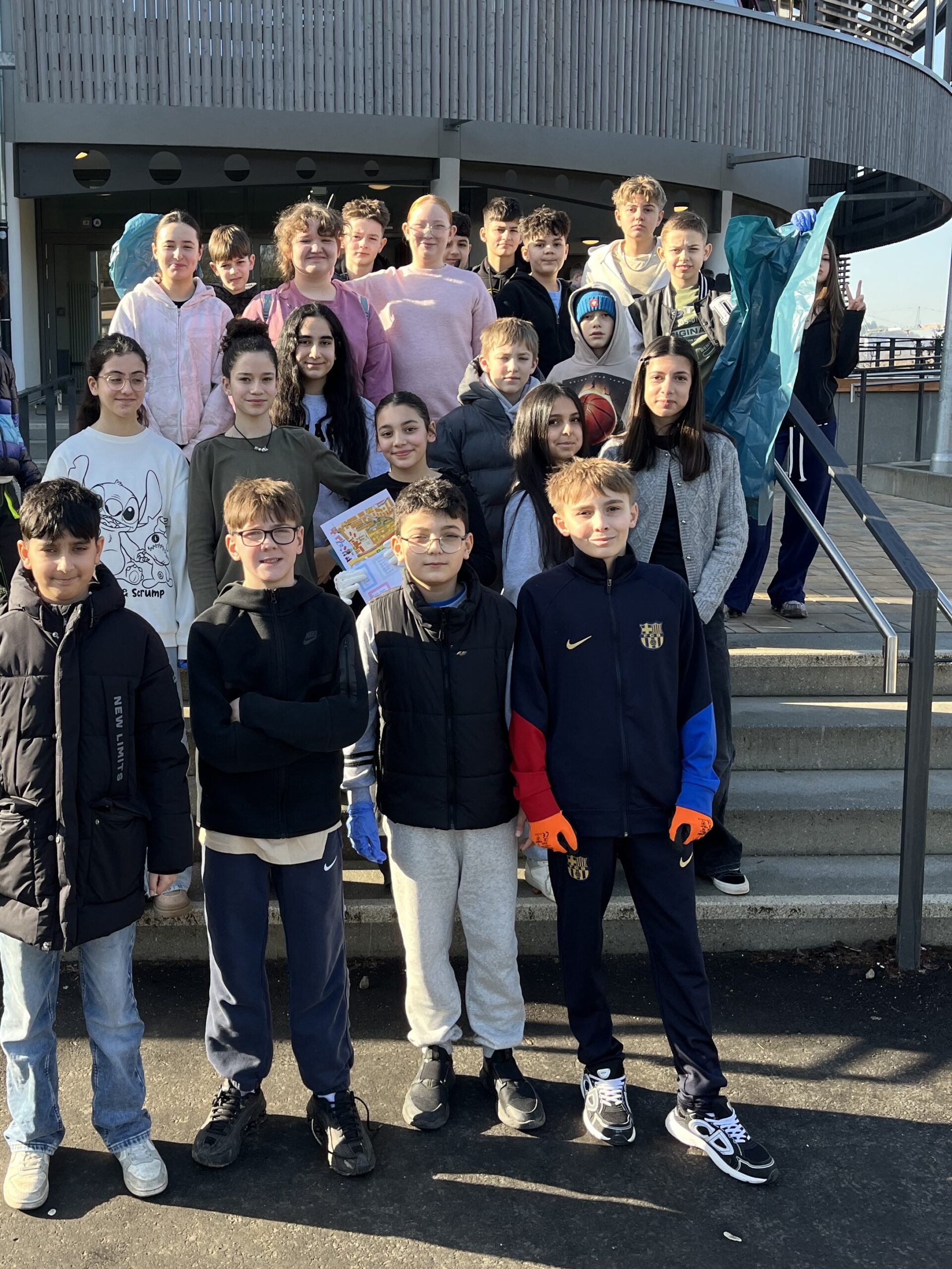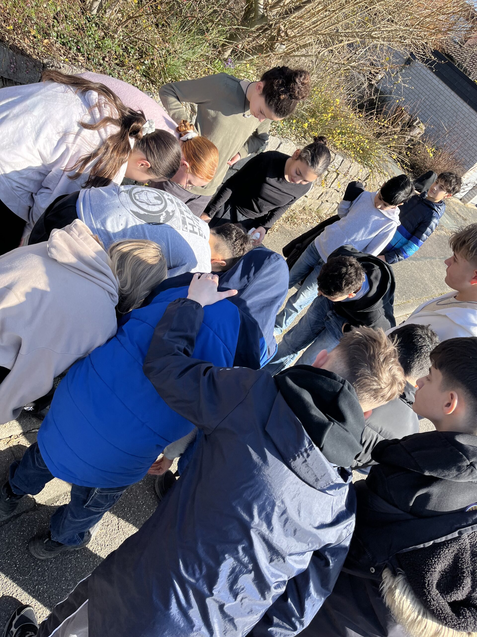Die 6d stach besonders hervor: Neben dem Sammeln von Müll entdeckten die Schülerinnen und Schüler einen Frosch, stärkten sich zwischendurch mit Laugenstangen, spielten ein Mülltrennungs-Kahoot und sahen einen Film über Müll von „Tobi, dem Checker“.